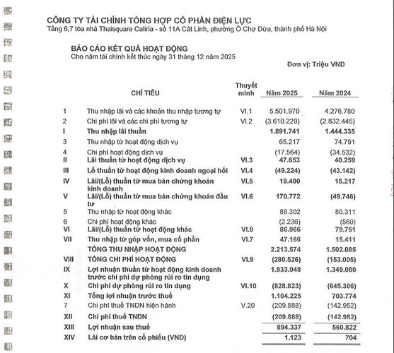 Năm 2025, EVF ghi nhận lợi nhuận trước thuế đạt 1.104,2 tỷ đồng, tăng 57% so với cùng kỳ, đồng thời, vượt 15% kế hoạch. Kết quả này có sự đóng góp từ biên lãi ròng (NIM) đạt 3,06% và hoạt động chứng khoán đầu tư đem lại cho EVF khoản lãi 170,7 tỷ đồng. Đây là mức lợi nhuận cao nhất của EVF kể từ khi thành lập và EPS đạt mức 1.123 đồng/01 cổ phiếu.