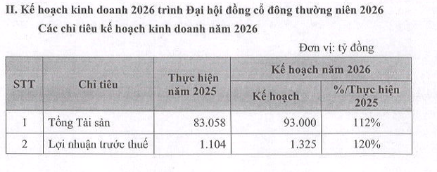 Nếu hoàn thành kế hoạch này, đây sẽ là mức lợi nhuận cao nhất trong lịch sử hoạt động của công ty. Bên cạnh chỉ tiêu lợi nhuận, quy mô tổng tài sản của doanh nghiệp dự kiến đạt 93.000 tỷ đồng vào cuối năm 2026, tương ứng mức tăng trưởng 12%.