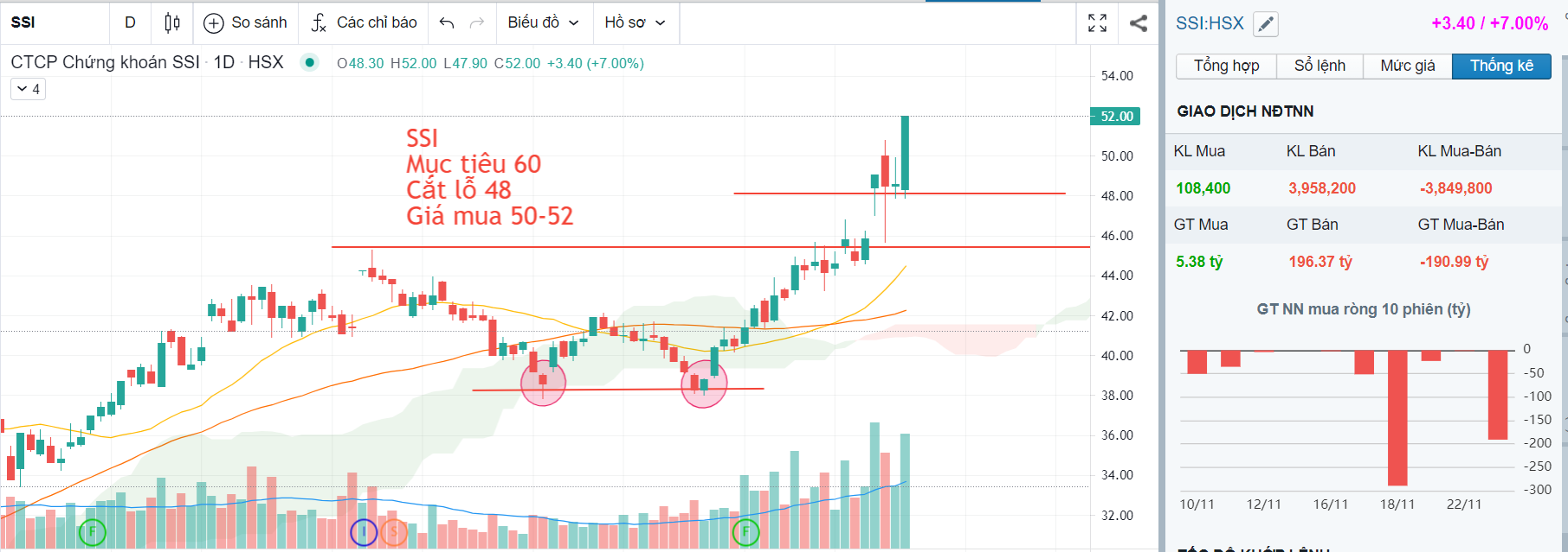 Giai đoạn giữa năm 2018-cuối năm 2019, trung bình giá trị giao dịch thị trường là 3,100 tỷ đồng và giá SSI trung bình giai đoạn này là 20,000 đồng/cp.