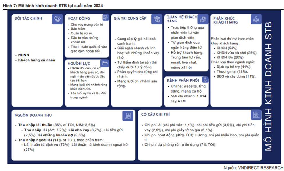 STB tập trung mạnh vào mảng cho vay bán lẻ, với 54% dư nợ tín dụng thuộc về khách hàng cá nhân, 31% thuộc về SME và 15% thuộc về doanh nghiệp lớn. Ngân hàng có lợi thế trong giải ngân nhanh các khoản vay nhỏ và vừa, nhờ quy trình xử lý hồ sơ tinh gọn, thẩm định tài sản nội bộ và ủy quyền quyết định tại chi nhánh, giúp tối ưu hóa tốc độ và hiệu quả phục vụ phân khúc bán lẻ và SME.