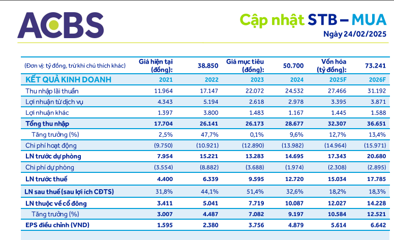 Dự báo STB sẽ nhận tổng cộng ~7.900 nghìn tỷ đồng từ thương vụ này trong năm 2025. Trong đó, ~5.100 tỷ đồng sẽ được dùng để tất toán trái phiếu VAMC. Cùng với mục tiêu đưa giá trị ròng trái phiếu VAMC về 0, kỳ vọng STB sẽ ghi nhận hoàn nhập dự phòng trái phiếu VAMC khoảng ~3.400 tỷ đồng.