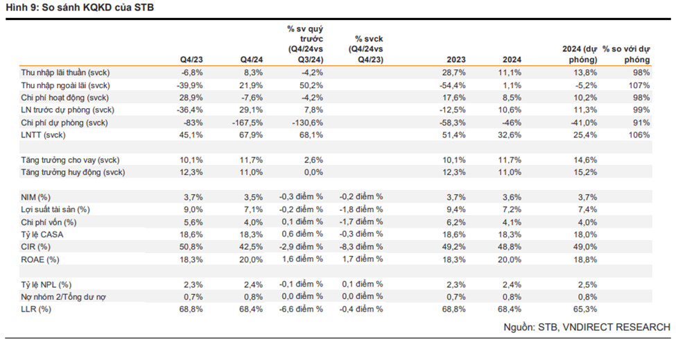 Trong bối cảnh chất lượng tài sản cải thiện và hoạt động kinh doanh cốt lõi hồi phục, STB có thể áp dụng chiến lược xóa nợ ít quyết liệt hơn. Theo đó, tỷ lệ xóa nợ vay khách hàng dự kiến giảm 6 điểm cơ bản svck trong năm 2025, giúp chi phí dự phòng cho vay khách hàng sẽ giảm 20,5% svck trong năm 2025.