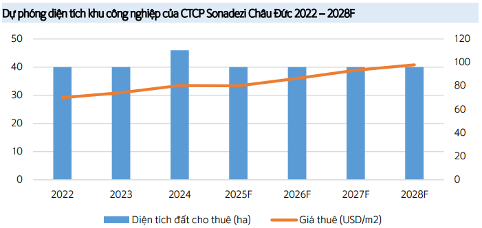 - Tỉnh Bà Rịa – Vũng Tàu tiếp tục là điểm đến thu hút mạnh dòng vốn đầu tư trực tiếp nước ngoài (FDI), với tổng vốn FDI đăng ký trong năm 2024 đạt 1,712 tỷ đồng, tăng 64% so với cùng kỳ. Xu hướng này góp phần thúc đẩy nhu cầu thuê đất tại KCN Châu Đức. Bên cạnh đó, với lợi thế về vị trí địa lý và sự phát triển của các dự án đầu tư hạ tầng, giá thuê đất tại KCN Châu Đức được dự báo sẽ tăng trưởng ở mức 5% - 8% trong giai đoạn 2025 – 2028. Tuy nhiên, những diễn biến của căng thẳng thương mại toàn cầu có thể ảnh hưởng tiêu cực đến nền kinh tế và làm suy giảm nhu cầu đầu tư của các doanh nghiệp. Trước bối cảnh trên, ước tính diện tích đất cho thuê mới của doanh nghiệp trong năm 2025 sẽ giảm nhẹ so với năm trước, ở mức khoảng 40 ha, và duy trì ổn định trong các năm tiếp theo.