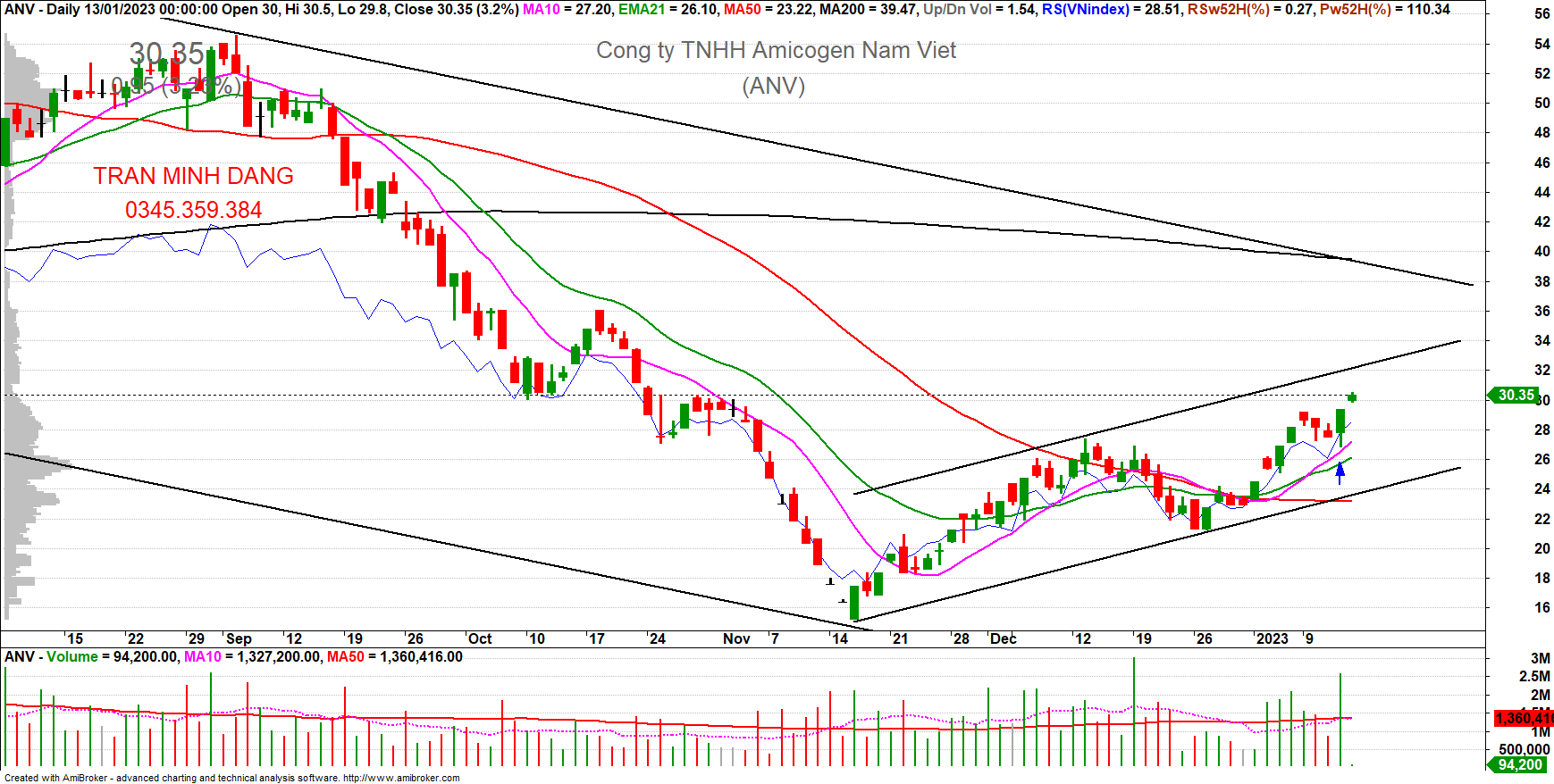 ANV bật tăng vs KLGD đột biến từ vùng hỗ trợ MA10 + đỉnh cũ T12.2022, hình thành mẫu hình nến Bullish Engufling, báo hiệu tiếp diễn xu hướng tăng ngắn hạn.