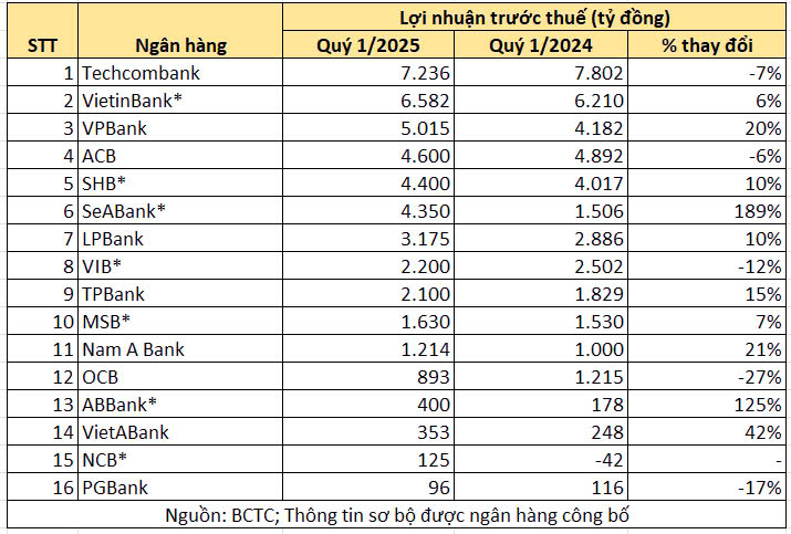 Ngân hàng TMCP Kỹ Thương Việt Nam (Techcombank) cho biết lợi nhuận trước thuế quý 1/2025 đạt 7.236 tỷ đồng, giảm 7,3% so với cùng kỳ 2024.