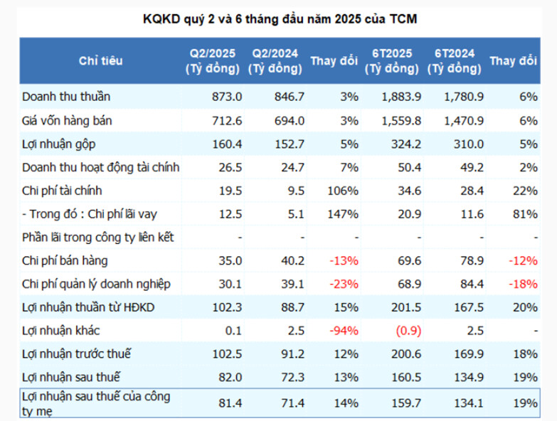 Lũy kế 6 tháng đầu năm 2025, TCM ghi nhận doanh thu thuần gần 1,884 tỷ đồng, tăng 6% và lợi nhuận ròng gần 160 tỷ đồng, tăng mạnh 19% so với cùng kỳ. Đây là mức lợi nhuận bán niên cao nhất từ trước đến nay của Doanh nghiệp.