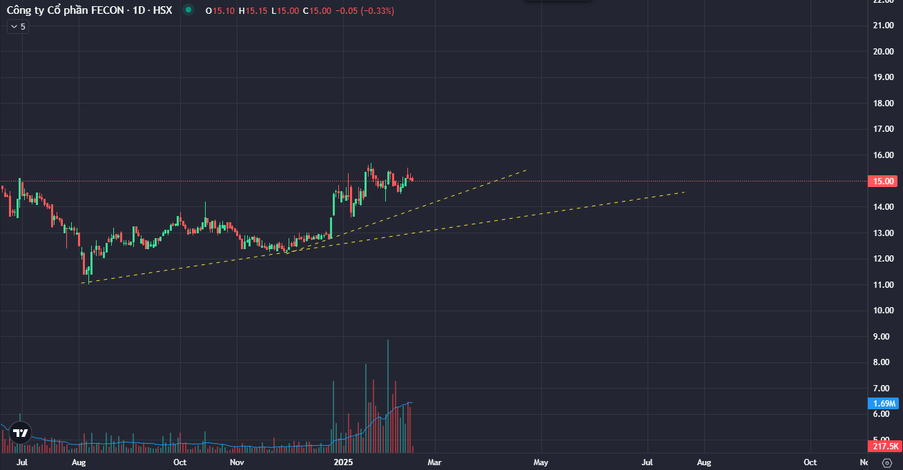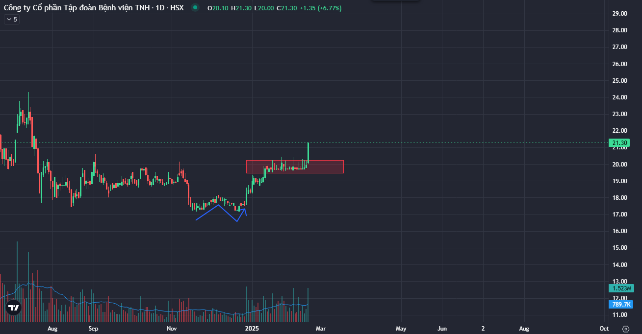 Cổ phiếu TNH đang trong xu hướng tăng kể từ khi hình thành 2 đáy vào tháng 12/2024.