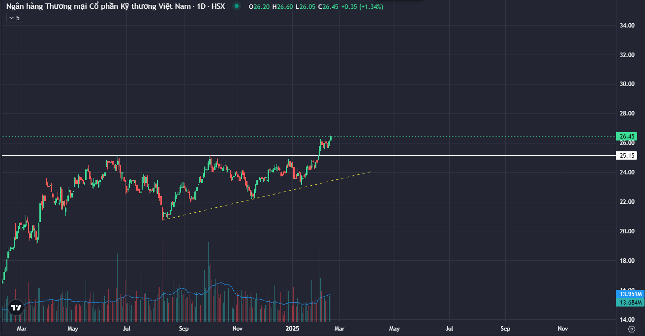 Cổ phiếu TCB đang trong xu hướng tăng dài hạn kể từ 11/2022.