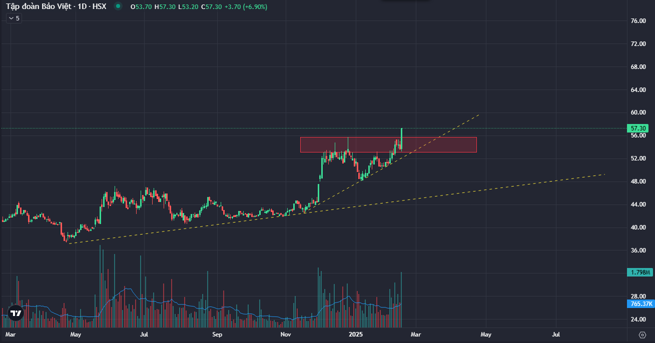 Breakout : Sau khi breakout vào ngày 7/2/2025 điều chỉnh với khối lượng thấp và vol tăng khi giá tăng chứng tỏ lực cầu hiện vẫn đang áp đảo lực cung