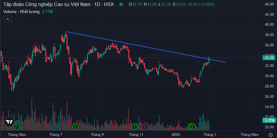 Xu hướng: GVR vừa phá vỡ xu hướng giảm trung hạn từ năm 2024, cho tín hiệu đảo chiều sang tăng tiếp diễn với xu hướng tăng dài hạn