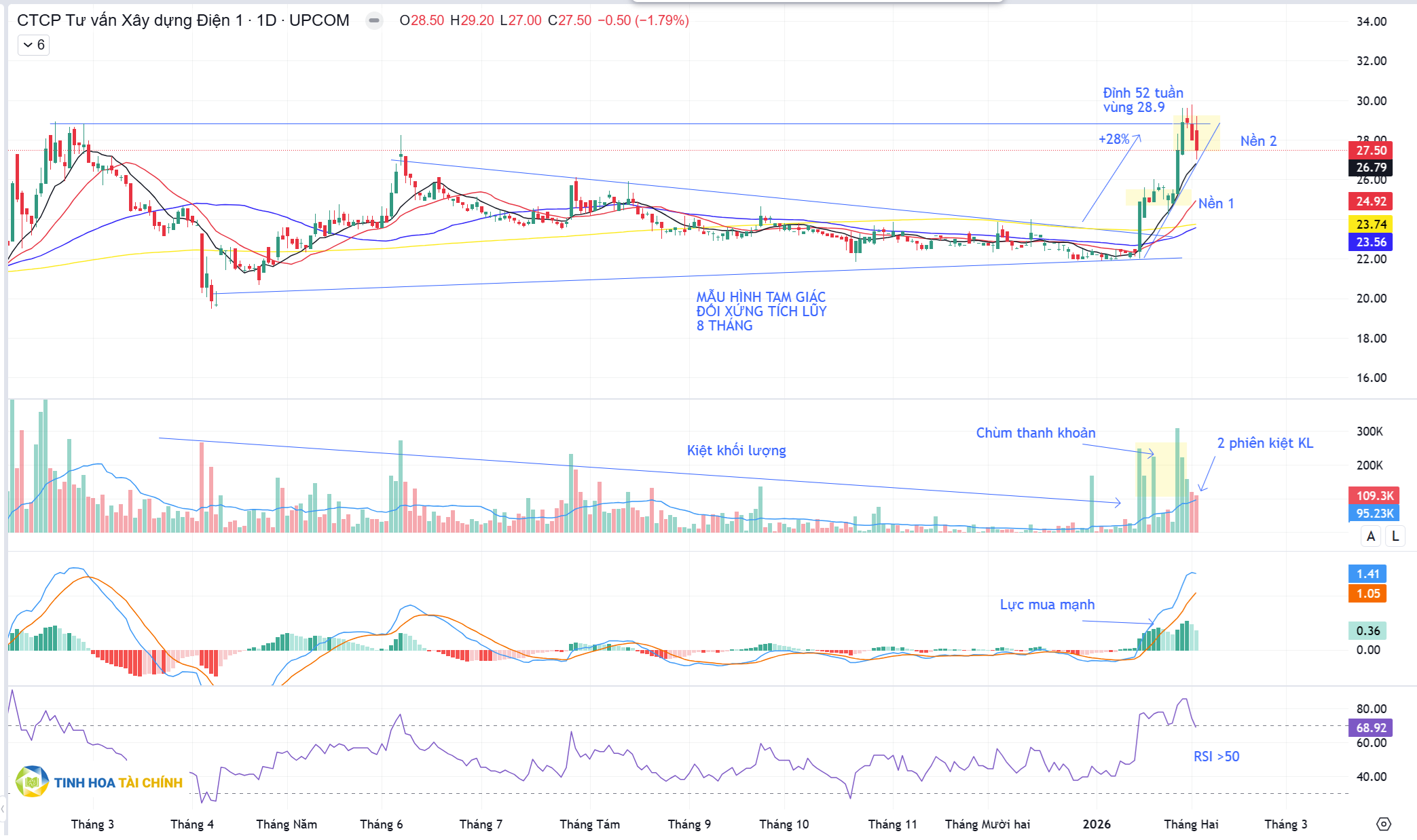 - Đồ thị chuẩn bị thiết lập đỉnh giá mới: Cổ phiếu đang tiệm cận đỉnh 52 tuần vùng 28,9 ngàn đồng/cp, nếu bứt thoát vùng này thì cổ phiếu sẽ thiết lập đỉnh giá mới, cổ phiếu đang tích lũy ở nền giá số 2 với 2 phiên kiệt về khối lượng, phiên hôm 03.02.2026 giá đang kéo ngược lại đường xu hướng tăng trong ngắn hạn. Nếu ở đây có 1 cây bùng nổ vượt vùng 28.9 đi kèm thanh khoản trên 300 ngàn cổ phiếu/ phiên thì chính thức TV1 vượt đỉnh thời đại