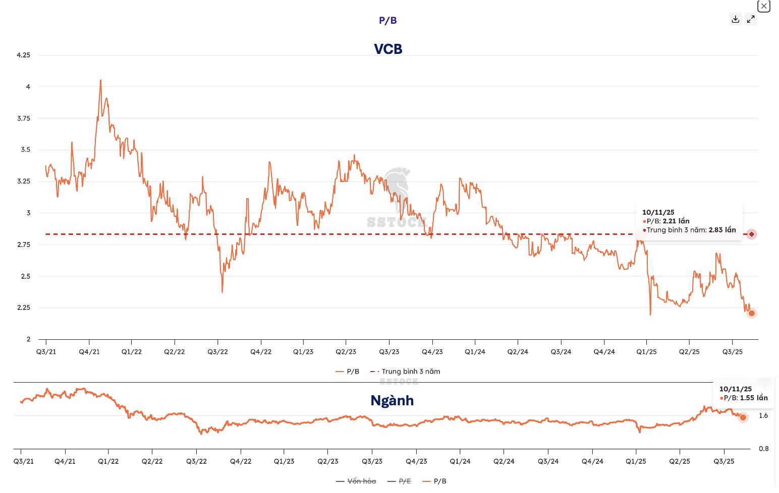 • P/B hiện tại ~2,2 lần, cao hơn trung bình ngành (1,5x), nhưng thấp hơn chính Vietcombank trong giai đoạn 2021–2022.