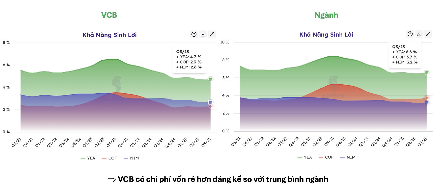 Điều này giúp Vietcombank có chi phí vốn (COF) chỉ khoảng 2,3%, thấp hơn rất nhiều so với trung bình ngành (3,7%).
