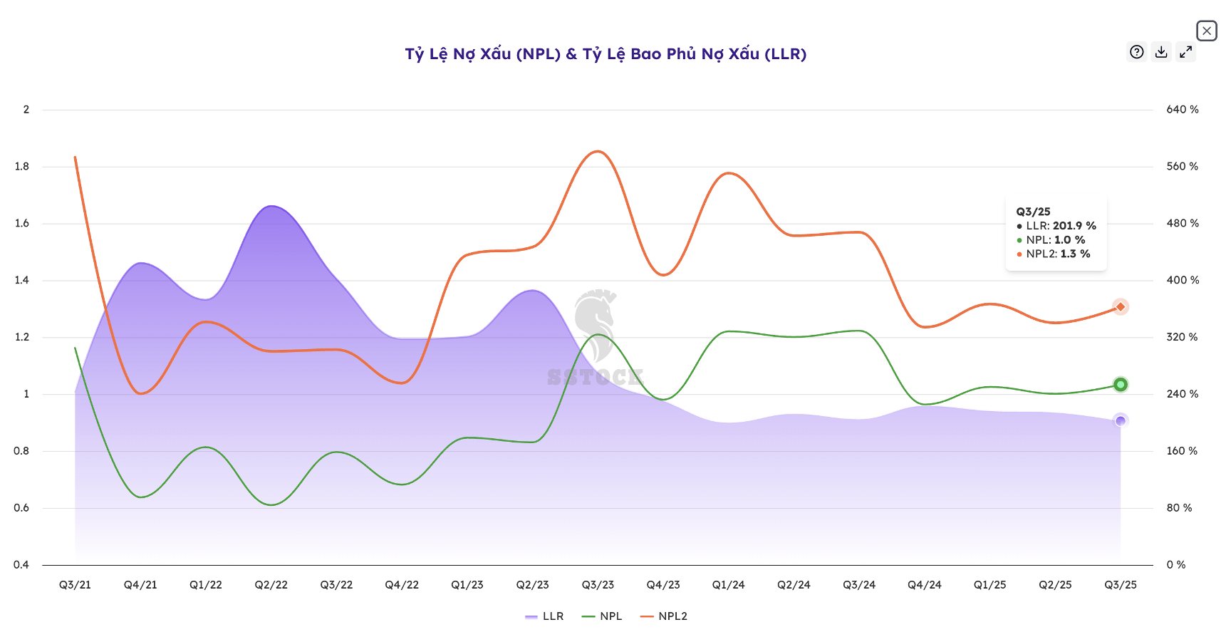 Đặc biệt, tỷ lệ bao phủ nợ xấu (LLR) đạt trên 200% – tức là với 1 đồng nợ xấu, ngân hàng có hơn 2 đồng dự phòng để xử lý.