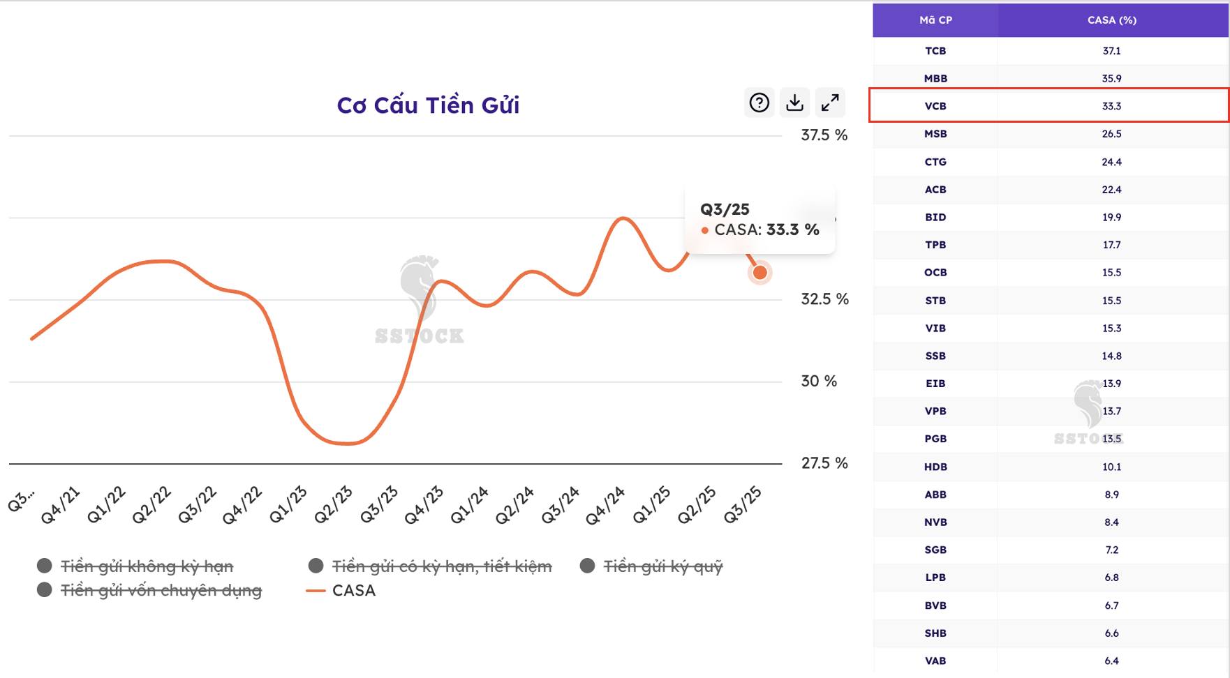 Một trong những lợi thế lớn nhất của Vietcombank chính là tỷ lệ CASA (tiền gửi không kỳ hạn) đạt tới 33,3%, chỉ đứng sau Techcombank và MBBank.