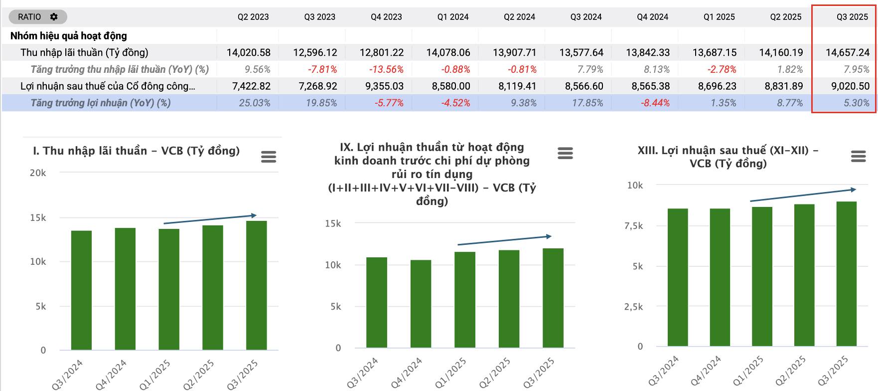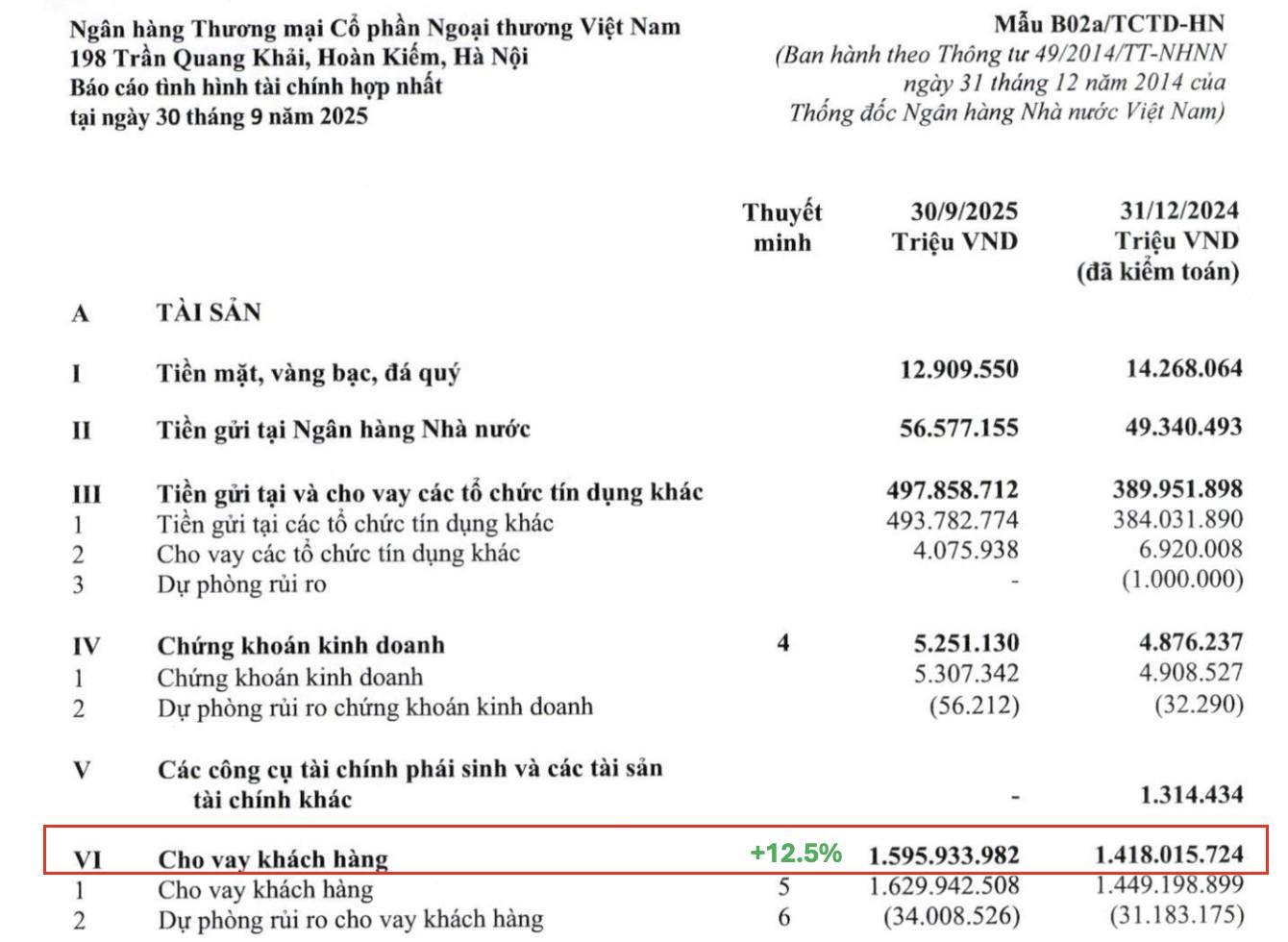 Tính đến cuối Quý 3/2025, VCB tăng trưởng tín dụng 12,5% so với đầu năm, thấp hơn một chút so với mức trung bình ngành (13,4%).