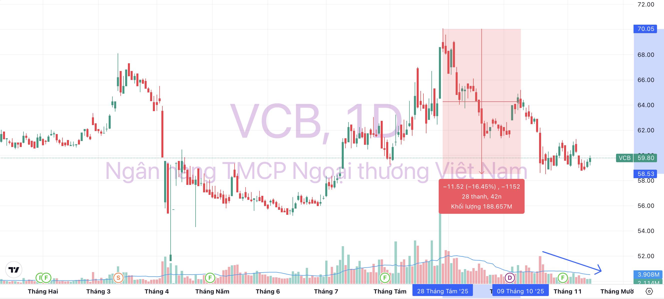 • Nếu so với các chu kỳ trước (sau Covid và khủng hoảng trái phiếu), VCB hiện đang chiết khấu khoảng 15% từ vùng đỉnh,