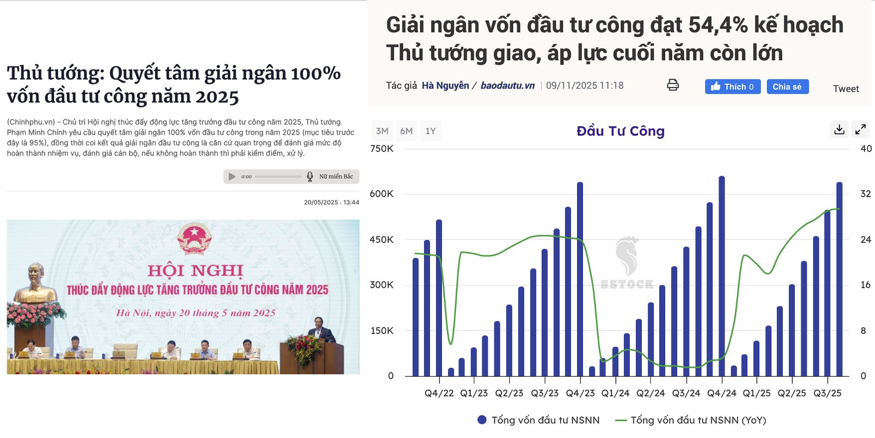 • Chính phủ đặt mục tiêu hoàn thành 100% kế hoạch giải ngân năm 2025, hiện mới đạt khoảng 55% tính đến tháng 10 → quý 4 sẽ là giai đoạn bơm vốn mạnh.