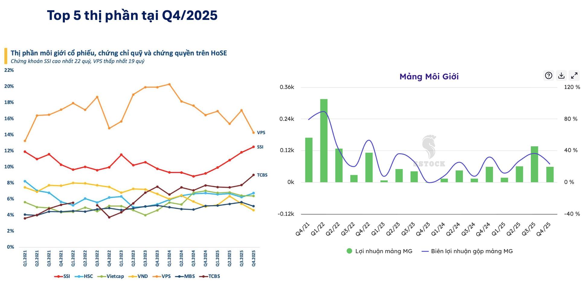 Tuy nhiên, xu hướng chung của ngành cho thấy biên lợi nhuận môi giới ngày càng mỏng, nên đây không phải yếu tố quyết định giá cổ phiếu dài hạn.