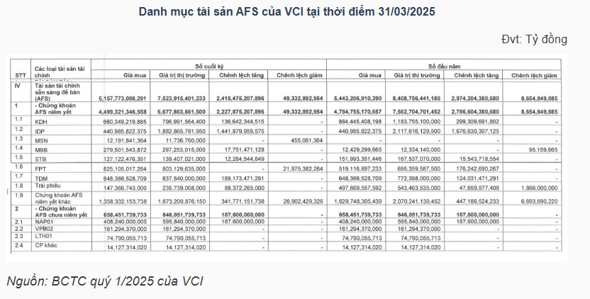 Ở mảng tài sản AFS, tổng quy mô danh mục giảm từ 8.4 ngàn tỷ đồng xuống còn 7.5 ngàn tỷ đồng. Một số cổ phiếu nổi bật trong danh mục AFS của VCI gồm KDH, IDP, MSN, MBB, STB, FPT, TDM. Đáng chú ý, Công ty đã mua mạnh MBB (tăng từ 12.4 tỷ đồng lên 279.5 tỷ đồng) và FPT (tăng từ 519 tỷ đồng lên 825 tỷ đồng) trong quý 1, trong khi lại bán ra cổ phiếu KDH. Đối với khoản đầu tư vào MBB, VCI tạm ghi nhận lãi 6%, còn khoản đầu tư vào FPT đang tạm lỗ gần 3%.