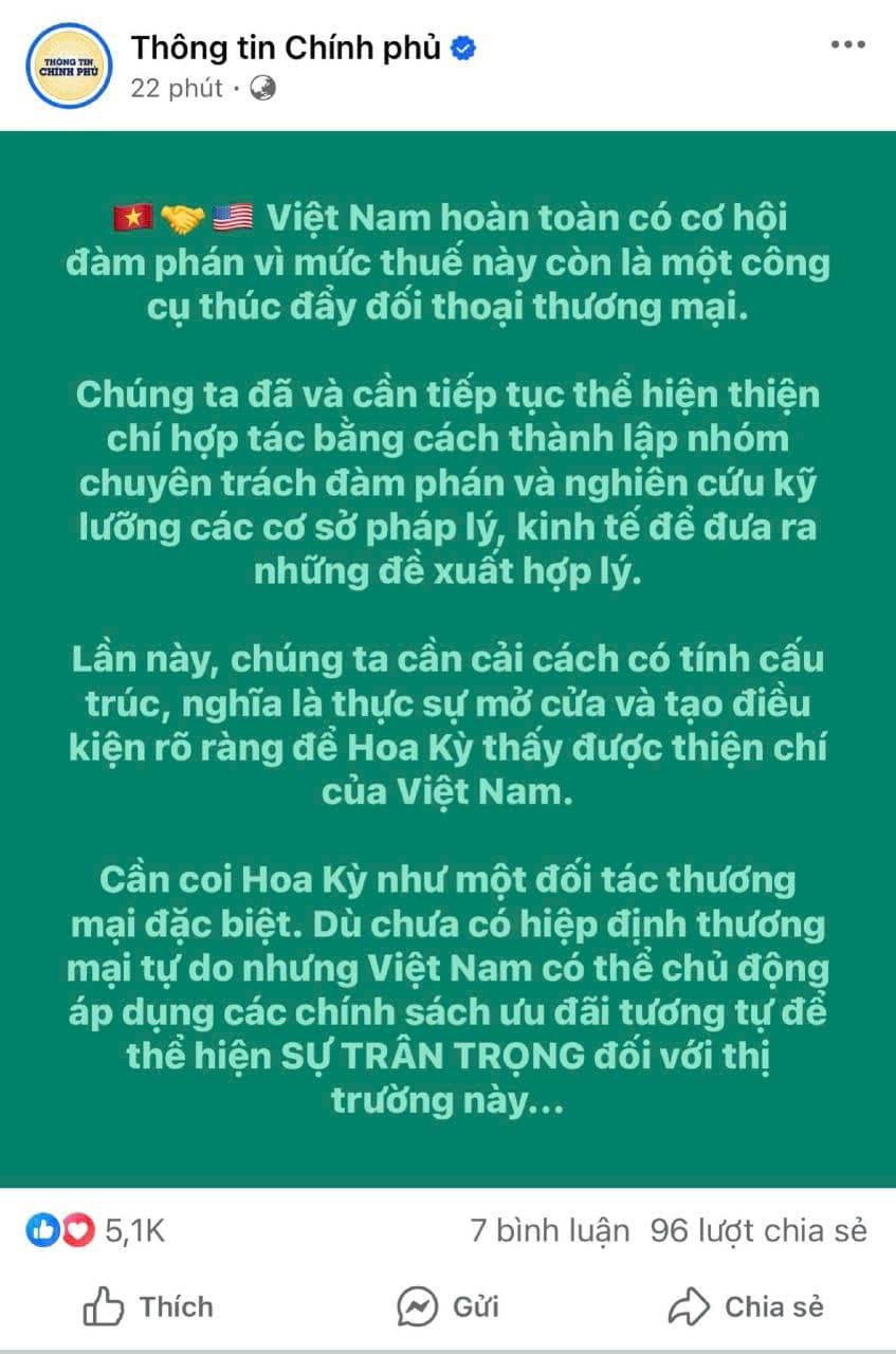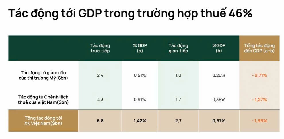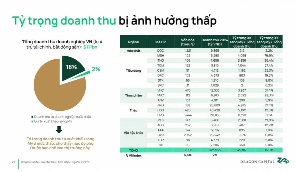 Một thông tin tham khảo nữa đó là: Theo Dragon Capital, ước tính dự kiến khi mức áp thuế 46% lên hàng hóa của VN nhập vào Mỹ sẽ có tác động đến khoảng 2% tổng GDP VN. Theo đó tổng doanh thu doanh nghiệp VN (trừ BĐS và tài chính) thì chỉ có 2% tổng doanh thu xuất khẩu sang Mỹ nên mức độ phụ thuộc vào thị trường này chưa quá mạnh.