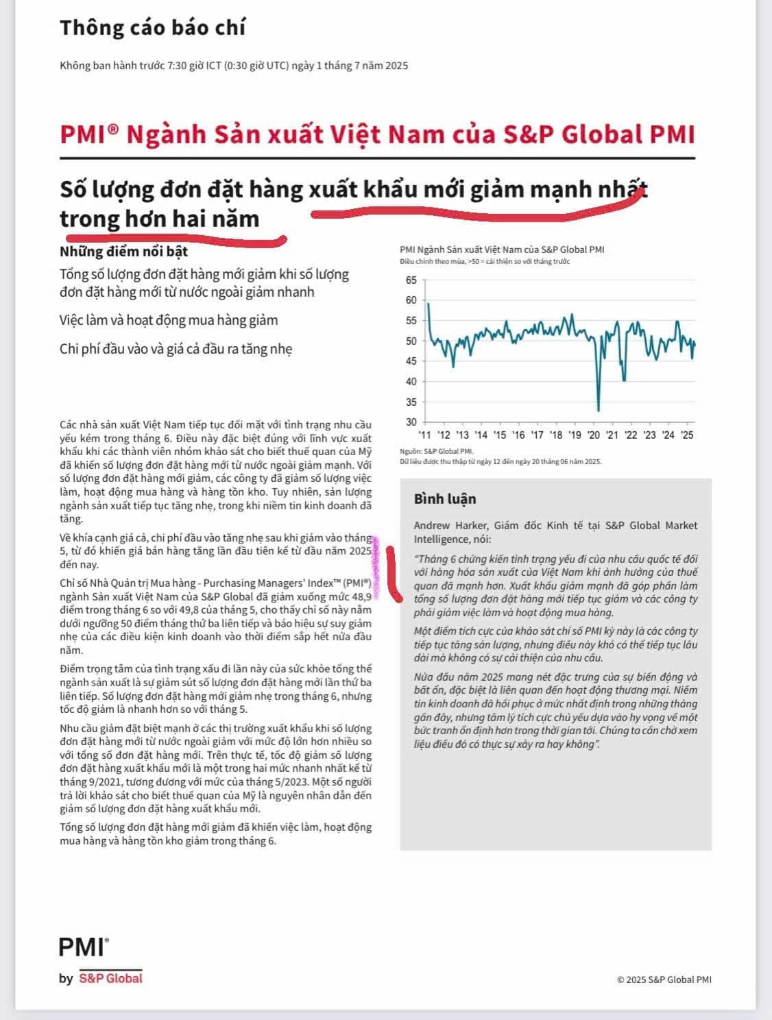 - PMI giảm (dưới 50) → Doanh nghiệp thu hẹp sản xuất → Tín hiệu tiêu cực, có thể kéo theo giảm tăng trưởng, thất nghiệp, giảm niềm tin đầu tư.
