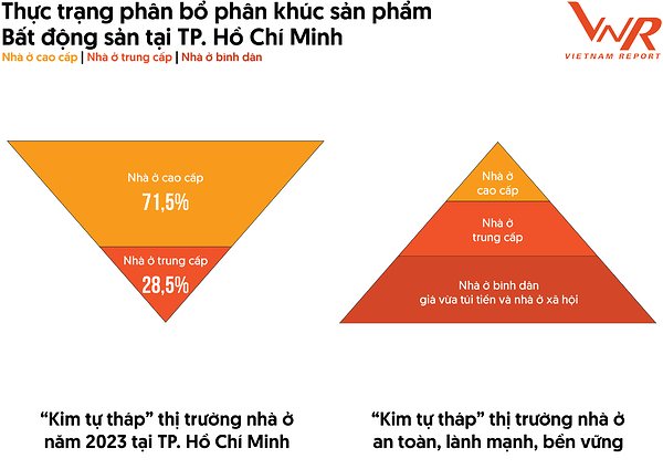 Trong thời kỳ tăng trưởng nóng của thị trường Bất động sản giai đoạn trước, một thị trường “có hàng là bán” khiến dòng vốn ồ ạt chảy vào là phân khúc nhà ở, căn hộ cao cấp, bất động sản nghỉ dưỡng. Đây là phân khúc sản phẩm có mức lợi nhuận cao hơn cho chủ đầu tư nhưng lại không phải phân khúc phục vụ nhu cầu ở thực của người dân, vì thế khi có tín hiệu xấu trên thị trường, dòng vốn đầu tư nhanh chóng chuyển qua thị trường khác, lượng hàng tồn kho giá trị lớn tăng cao đẩy hàng loạt doanh nghiệp vào thế khó. Theo dữ liệu khảo sát của Hiệp hội Bất động sản TP. Hồ Chí Minh (HoREA), tồn tại một nghịch lý trong phân bổ phân khúc sản phẩm Bất động sản – “kim tự tháp ngược” (Hình 3). Theo đó, nhà ở cao cấp đang chiếm 71,5% thị trường, lấn át hoàn toàn các phân khúc còn lại. Hơn nữa, sự thiếu vắng phân khúc nhà ở bình dân, nhà ở xã hội cho thấy một phân khúc thị trường đang bị bỏ ngỏ, sự chênh lệch cung-cầu đặt ra bài toán cần giải quyết không chỉ đối với doanh nghiệp mà còn với các cơ quan nhà nước trong xây dựng thị trường bất động sản an toàn, lành mạnh và bền vững.
