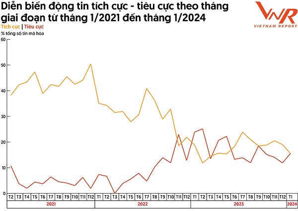 Hình 10: Diễn biến động tin tích cực - tiêu cực theo tháng giai đoạn từ tháng 1/2021 đến tháng 1/2024
