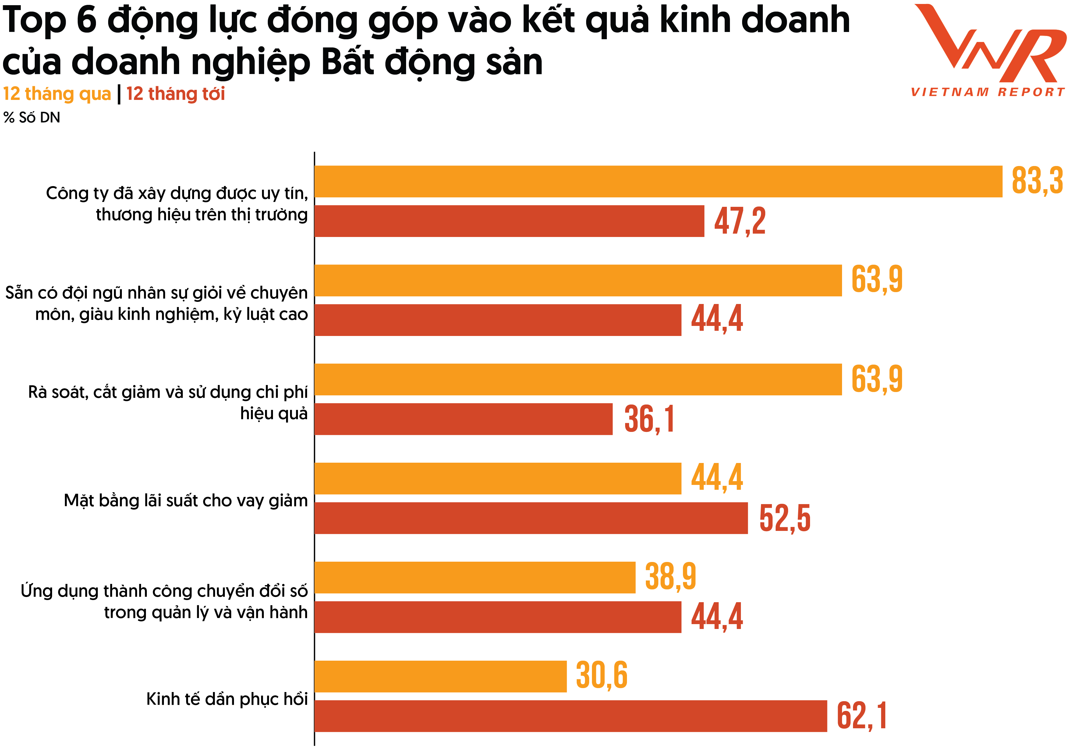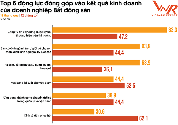 Bước sang năm 2024, thị trường Bất động sản được kỳ vọng có bước chuyển mình mạnh mẽ hơn từ mức nền thấp của năm 2023. Khảo sát doanh nghiệp bất động sản của Vietnam Report cho thấy năm vừa qua ba động lực lớn nhất đóng góp vào kết quả kinh doanh là Uy tín, thương hiệu của công ty trên thị trường (83,3%); Đội ngũ nhân sự giỏi về chuyên môn, giàu kinh nghiệm, kỷ luật cao (63,9%); Rà soát, cắt giảm và sử dụng chi phí hiệu quả (63,9%). Tận dụng vị thế, uy tín có sẵn, cùng biện pháp “thắt lưng buộc bụng” đã phần nào giúp các doanh nghiệp bất động sản duy trì hoạt động, mong chờ một thị trường sôi động hơn trong năm 2024. Ba động lực được các doanh nghiệp kỳ vọng sẽ đóng góp nhiều hơn vào kết quả kinh doanh trong 12 tháng tiếp theo là Kinh tế dần phục hồi (62,1%, +30,5%); Mặt bằng lãi suất giảm (52,5%, +8,1%); Ứng dụng thành công chuyển đổi số trong quản lý vận hành (44,4%, +5,5%).