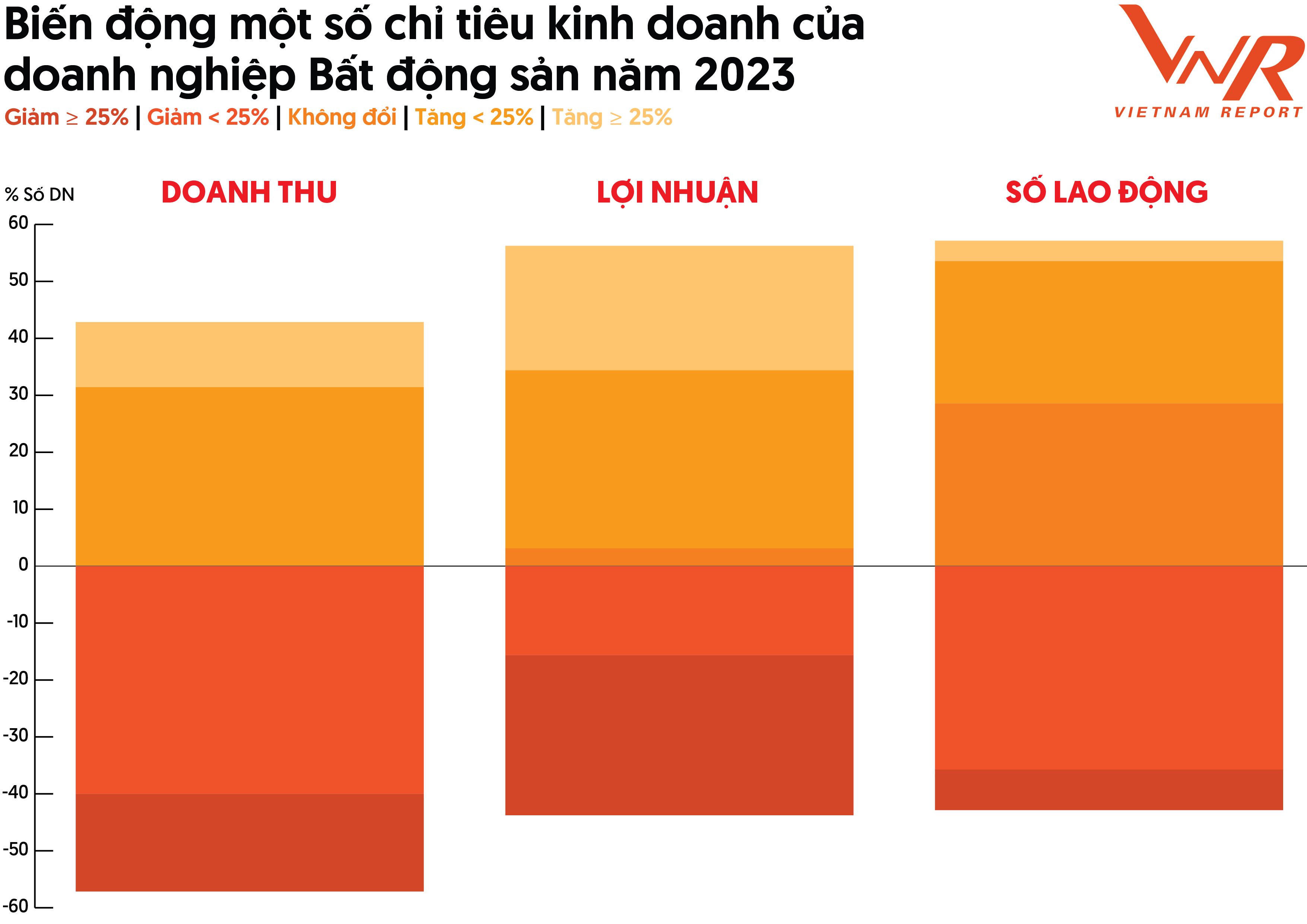 Bối cảnh khó khăn của nền kinh tế nói chung và của thị trường Bất động sản nói riêng đã phủ một gam màu xám lên bức tranh tình hình kinh doanh của phần lớn doanh nghiệp trong ngành. Theo số liệu từ Tổng cục Thống kê, tính đến hết năm 2023, số doanh nghiệp Bất động sản giải thể tiếp tục gia tăng, lên tới 1.286 doanh nghiệp, tăng 7,7% so với năm 2022 (con số này trong năm 2022 cũng cho thấy mức tăng đáng kể so với các năm trước). Đáng chú ý, ngành kinh doanh Bất động sản có tới 3.705 doanh nghiệp ngừng kinh doanh có thời hạn, tăng 47,4% so với năm 2022. Theo kết quả khảo sát của Vietnam Report, tỷ lệ doanh nghiệp ghi nhận doanh thu và lợi nhuận giảm dưới 25,0% trong năm 2023 lần lượt là 41,2% và 16,1%. Trong khi số doanh nghiệp có mức giảm lớn hơn ghi nhận với tỷ lệ lần lượt 14,7% và 25,8%. Kết quả kinh doanh của các doanh nghiệp trong ngành tiếp tục đà giảm của năm 2022, buộc các doanh nghiệp phải cắt giảm nhân sự, gần một nửa (42,9%) số doanh nghiệp tham gia khảo sát ghi nhận số lượng lao động giảm trong năm 2023.