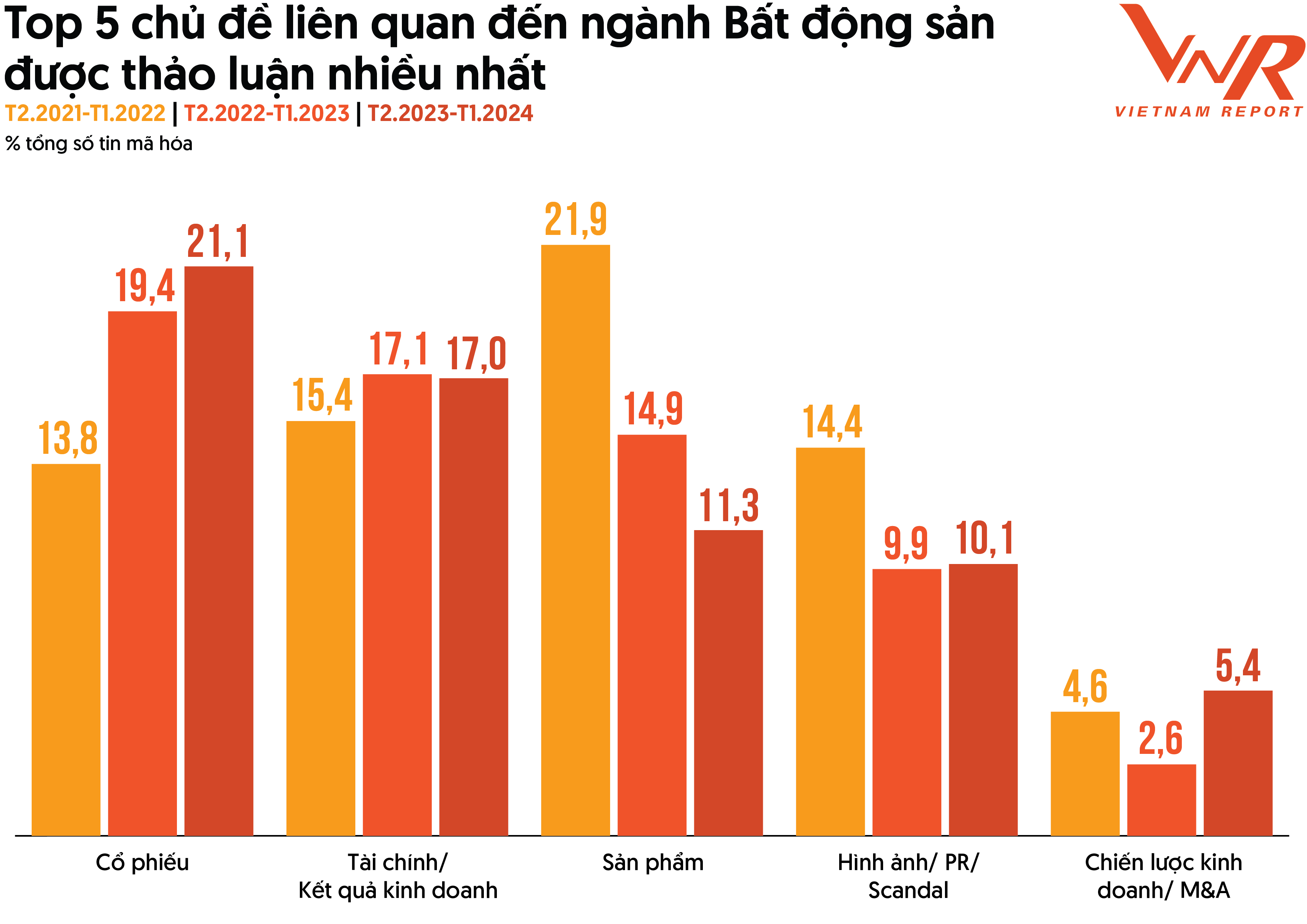 Top 5 chủ đề được nhắc đến nhiều nhất trong năm nay bao gồm Cổ phiếu (21,1%), Tài chính/Kết quả kinh doanh (17,0%), Sản phẩm (11,3%), Hình ảnh/PR/Scandal (10,1%) và Chiến lược kinh doanh/ M&A (5,4%). Trong đó, chủ đề Cổ phiếu vẫn duy trì tỷ trọng lượng thông tin nhiều nhất, những biến động trên thị trường cổ phiếu, cùng các sự kiện liên quan đến phát hành trái phiếu, đáo hạn trái phiếu đóng góp đáng kể lượng tin tức cho nhóm chủ đề này và có sự tăng dần qua các năm. Ở phía ngược lại, nhóm chủ đề Sản phẩm lại suy giảm và không duy trì được vị trí dẫn đầu như giai đoạn trước. Trong khi đó nhóm Chiến lược kinh doanh/ M&A lại gia tăng tỷ trọng và có mặt trong Top 5 nhóm chủ đề xuất hiện nhiều nhất năm 2024. Kết quả trên đã phản ánh phần nào.
