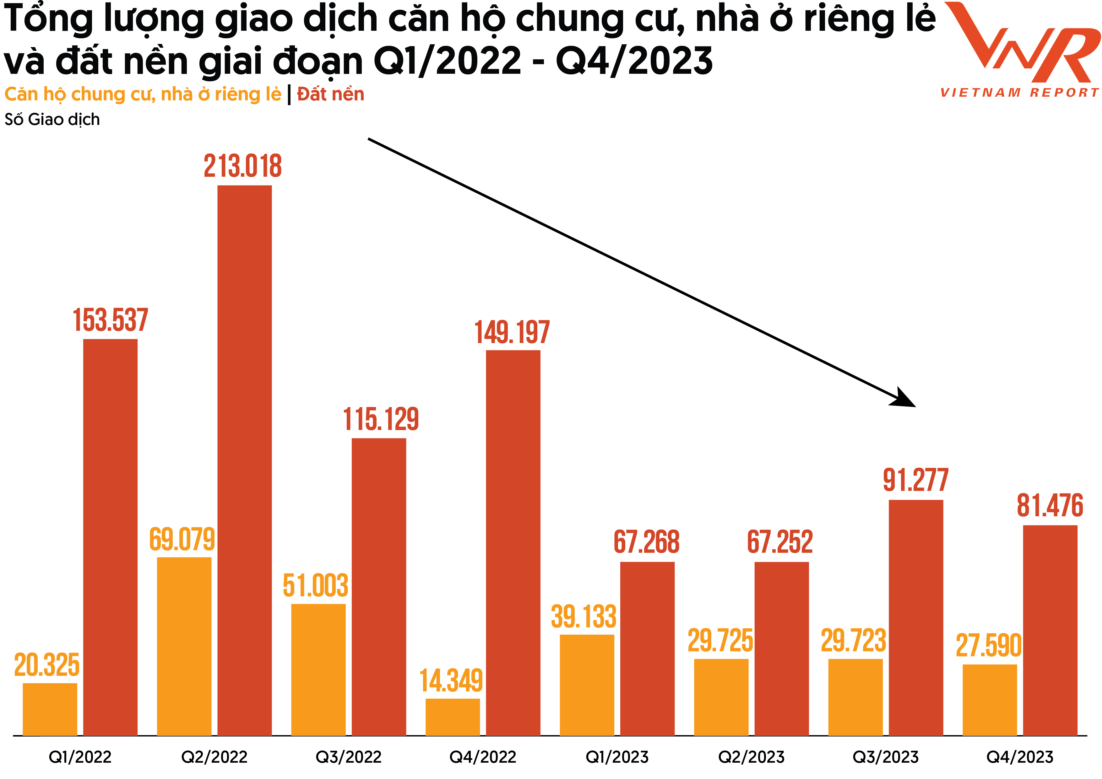 Theo thống kê của Bộ Xây dựng, kể từ sau khi bùng nổ lượng giao dịch Bất động sản vào Q2/2022, thị trường bắt đầu trượt dốc từ Q3/2022 (khi có sự điều chỉnh mạnh mẽ về chính sách nhằm kiểm soát tín dụng ngành Bất động sản, các sai phạm của một số doanh nghiệp lớn bị phát hiện, cùng với trần lãi suất lập đỉnh, thanh khoản lao dốc, thị trường bất động sản rơi vào điểm nghẽn) và duy trì tình trạng khó khăn trong suốt cả năm 2023. Xét tổng số giao dịch căn hộ chung cư, nhà ở riêng lẻ và đất nền cho tới hiện tại, thị trường đã lập đáy vào Q2/2023 với số giao dịch chỉ bằng 34,38% so với thời kỳ lập đỉnh. Xét riêng nhóm căn hộ chung cư, nhà ở riêng lẻ, số lượng giao dịch xuống mức thấp nhất trong Q4/2022 (14.349 giao dịch); sự phục hồi còn của nhóm này còn chưa rõ ràng khi số giao dịch có chiều hướng giảm dần trong năm 2023 với lượng giao dịch 6 tháng cuối năm giảm 16,67% so với 6 tháng đầu năm. Đối với nhóm đất nền, tuy xu hướng giảm vẫn là chủ đạo trong giai đoạn 2022-2023 nhưng điểm sáng về sự phục hồi được ghi nhận khi lượng giao dịch 6 tháng cuối năm đã cao hơn 6 tháng đầu năm 28,42%.