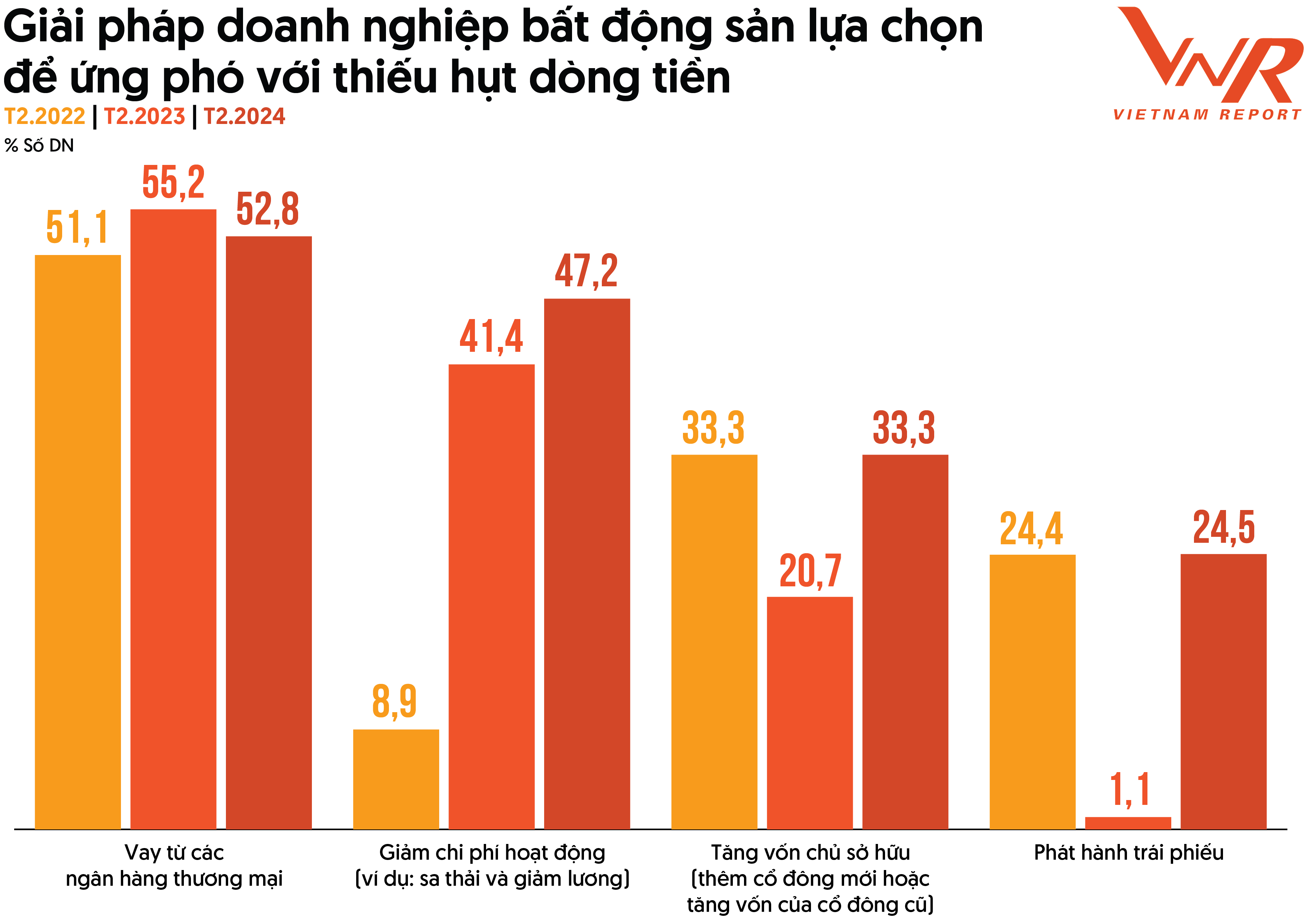 Nguồn: Vietnam Report, Khảo sát doanh nghiệp Bất động sản, T háng 2/2022, tháng 2/2023 và tháng 2/2024
