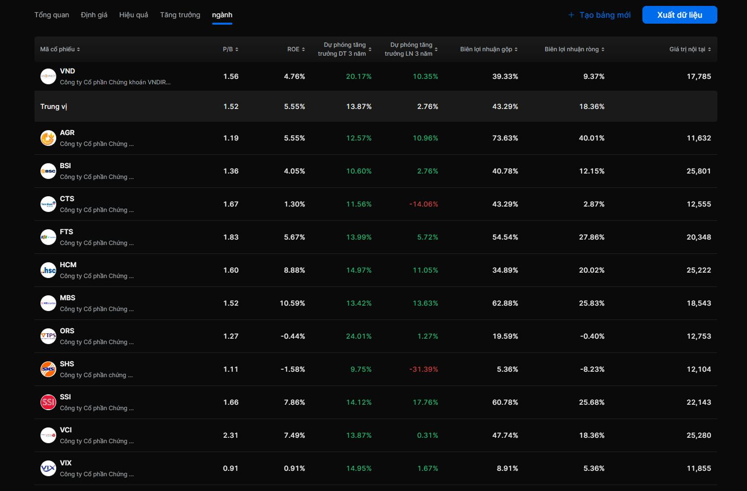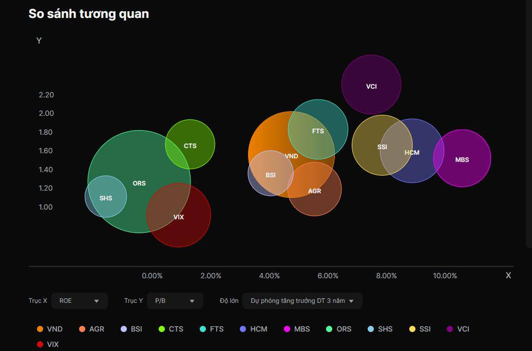 Về định giá, CTCK báo cáo khá giống với ngân hàng, và tài sản chủ yếu là tiền hoặc chứng khoán (thanh khoản khá cao) nên định giá P/B thường được ưa chuộng đem ra sử dụng, kết hợp với ROE và tốc độ tăng trưởng để tìm ra doanh nghiệp tiềm năng. (hình 2) và (hình 3)