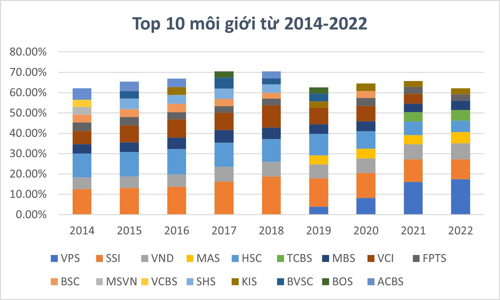 năm 2022, top 9 chiếm hơn 60% tổng thị trường môi giới ở Việt Nam, (hình 1) 40% còn lại bị các CTCK nhỏ tranh giành nhau.