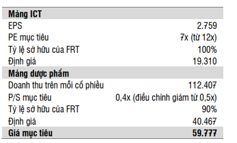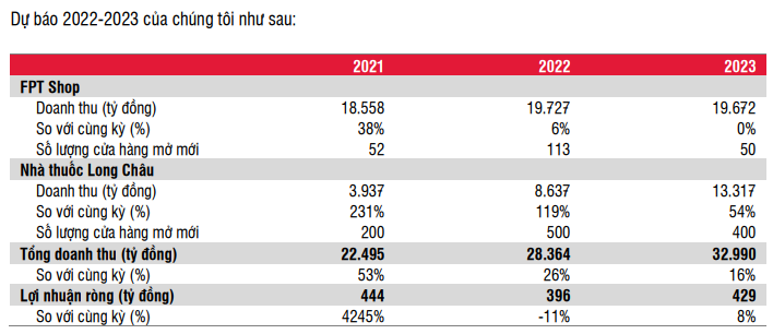 Nhà thuốc Long Châu: FRT sẽ tiếp tục mở mạnh chuỗi nhà thuốc Long Châu do tỷ lệ kênh nhà thuốc thương mại hiện đại trong bán lẻ dược phẩm vẫn còn rất nhỏ và chuỗi nhà thuốc Long Châu đang ghi nhận lợi nhuận ròng. Bên cạnh đó, đối thủ là nhà thuốc An Khang sẽ không mở mới trong thời gian tới. Trong năm 2022-2023, FRT sẽ mở lần lượt 500 và 400 nhà thuốc Long Châu. Doanh thu hàng tháng trên mỗi nhà thuốc ước tính ổn định ở mức 1,1 tỷ đồng (so với mức cao nhất 1,4-1,5 tỷ đồng trong quý 1 năm 2022).