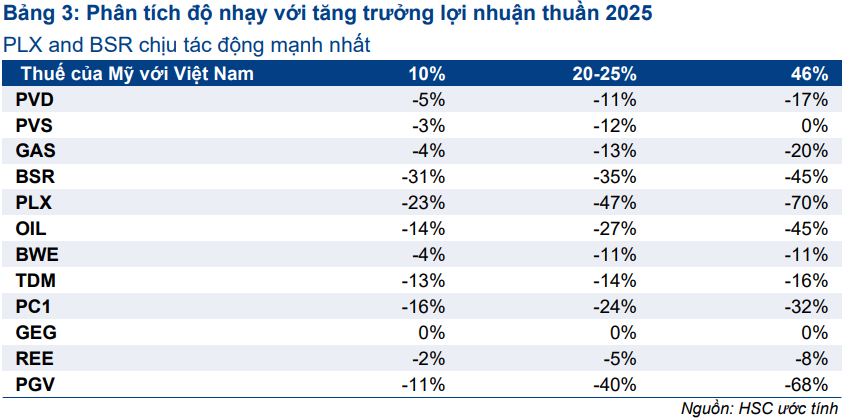 Trong 3 kịch bản, tổng lợi nhuận thuần của ngành Điện và Dịch vụ tiện ích sẽ giảm 8%, 17% và 26% trong năm 2025, tương ứng với các mức thuế áp lên hàng hóa xuất khẩu của Việt Nam. Trong danh sách khuyến nghị, các cổ phiếu GAS, BWE, GEG và PC1 nhờ có mức độ ảnh hưởng từ chính sách thuế của Mỹ thấp. Lợi nhuận giảm với cả 3 kịch bản