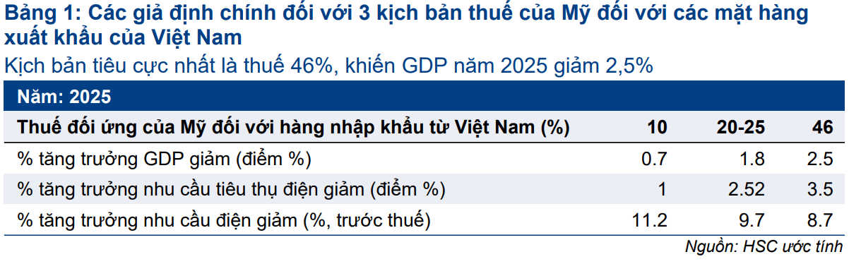Trong ngành điện, dự báo cứ 1 điểm phần trăm giảm của GDP sẽ làm mức tăng trưởng về nhu cầu điện giảm 1,4 điểm phần trăm. Hơn nữa, dự báo sản lượng tiêu thụ của các nhà máy nhiệt điện sẽ giảm mạnh hơn so với các nhà máy điện tái tạo, do chính sách ưu tiên huy động nguồn điện tái tạo. Với kịch bản thuế 46%, dự báo nhu cầu điện của Việt Nam sẽ tăng 8,7% trong năm 2025.