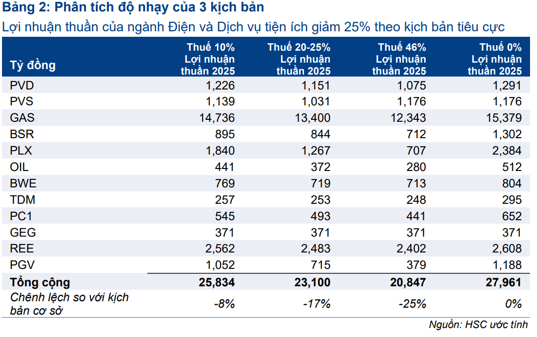 HSC áp dụng cùng mức giả định giảm của tốc độ tăng trưởng GDP đã được đề cập ở phần trên cũng như giả định tỷ giá USD/VND giảm khi xét đến tất cả các công ty trong ngành Điện và Dịch vụ tiện ích.