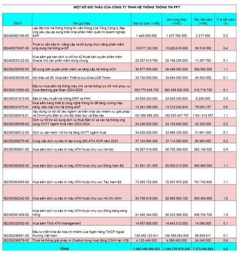 Theo tìm hiểu, công ty FPT thực hiện nhiều gói thầu liên quan đến giải pháp công nghệ có giá trị nhưng lại đạt tỉ lệ tiết kiệm thấp cho chủ đầu tư. Tìm hiểu ngẫu nhiên của phóng viên khoảng 20 gói thầu mà công ty FPT đã trúng từ đầu năm 2024 đến nay, đa số tiết kiệm rất thấp, loanh quanh mức 0%. Tổng giá trị của 20 gói này là hơn 1,3 nghìn tỷ đồng nhưng tiết kiệm được cho chủ đầu tư chỉ khoảng 7,3 tỷ đồng, đạt tỉ lệ 0,5%.