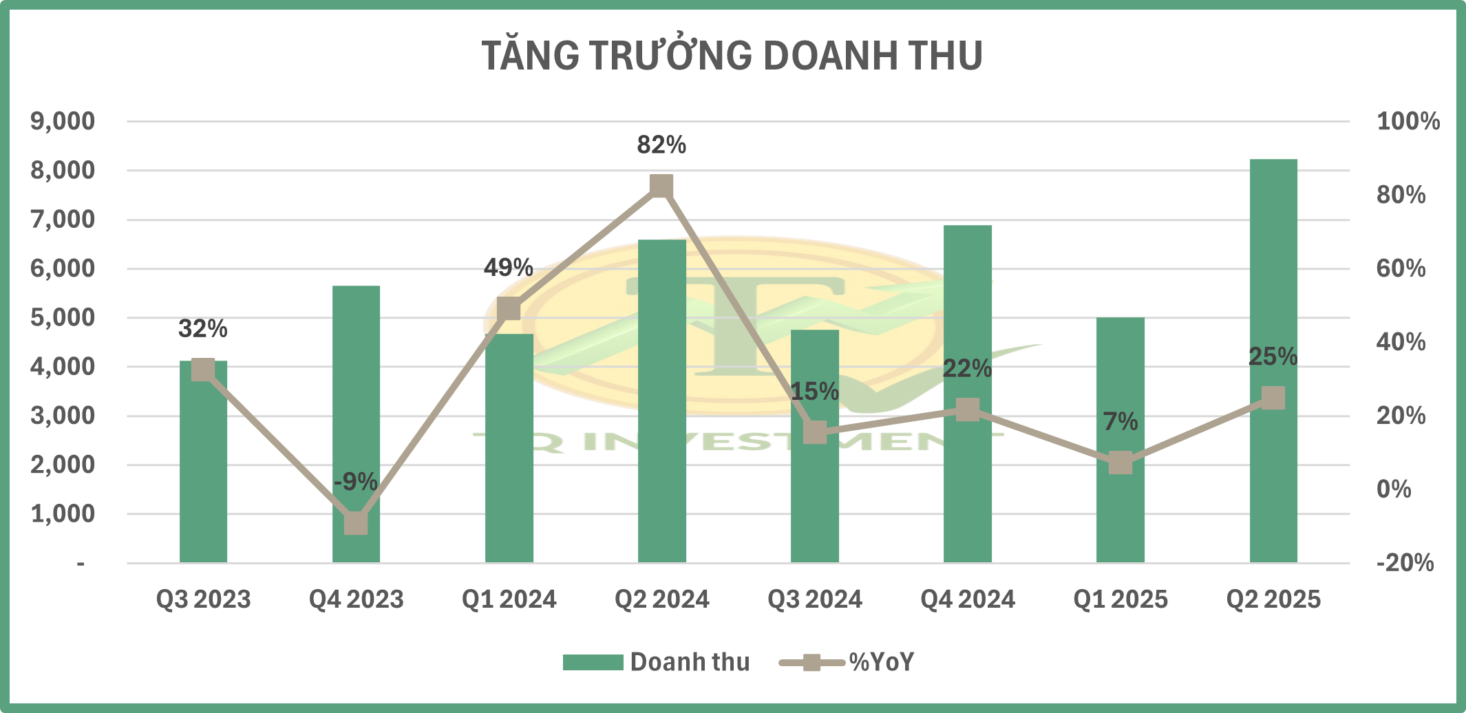 - Doanh thu H1/2025 đạt 13.2k tỷ, tăng trưởng 17.5% so với cùng kỳ bất chấp mức nền tăng trưởng năm ngoái tương đối cao, động lực đến từ hoạt động kinh doanh chính tăng trưởng tốt (Thị trường BĐS hồi phục)