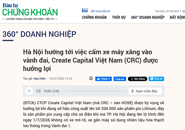 a. Hưởng lợi từ chính sách cấm xe máy xăng tại Hà Nội: Theo kế hoạch của TP. Hà Nội, từ năm 2030, xe máy xăng sẽ bị hạn chế vào vành đai nội đô để giảm ô nhiễm. CRC, với công suất sản xuất pin lithium cho xe điện lớn (500.000 bộ/năm), sẽ là beneficiary trực tiếp. Nhu cầu pin thay thế sẽ tăng vọt, giúp doanh thu mảng này bứt phá 20-30% hàng năm.