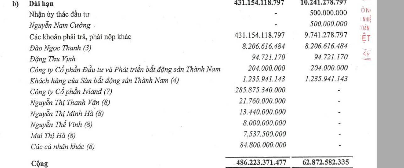 Ra báo cáo kiểm toán rồi anh em ạ. Xin anh em cho ý kiến mổ xẻ tiếp ạ. Như trong này thì em đã đoán đúng, khoản vay dài hạn của CSC là hợp đồng góp vốn của Eco. Tuy nhiên, có một khoản góp lớn, tới 285 tỷ của Ivland. Mọi người nhận định sao về mục này ạ? Em chưa hiểu lắm. Các khoản cá nhân thì em đang hiểu là góp vốn đặt chỗ khi chưa được mở bán. Tuy nhiên, khoản góp của 1 tổ chức thì… hơi lạ. Liệu là một khách hàng lớn mua gom để đầu tư? Hay là CSC phải huy động thêm rồi phải cắt một phần lợi nhuận cho anh IVland này? Có bác nào làm trong ngành BĐS quen thuộc với hình thức góp vốn này thì xin cho em ý kiến với ạ. khoản gần 700 tỏi dở dang thì đúng là của Eco rồi