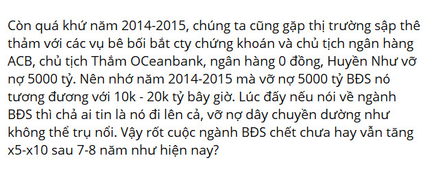 Ôi chào, BĐS thì vẫn sẽ tăng thôi, nhưng cần chọn được công ty lành mạnh, có khả năng mở rộng. Ngoài ra, nó có chu kỳ, phải đợi khá lâu nếu vào giai đoạn hết chu kỳ rồi