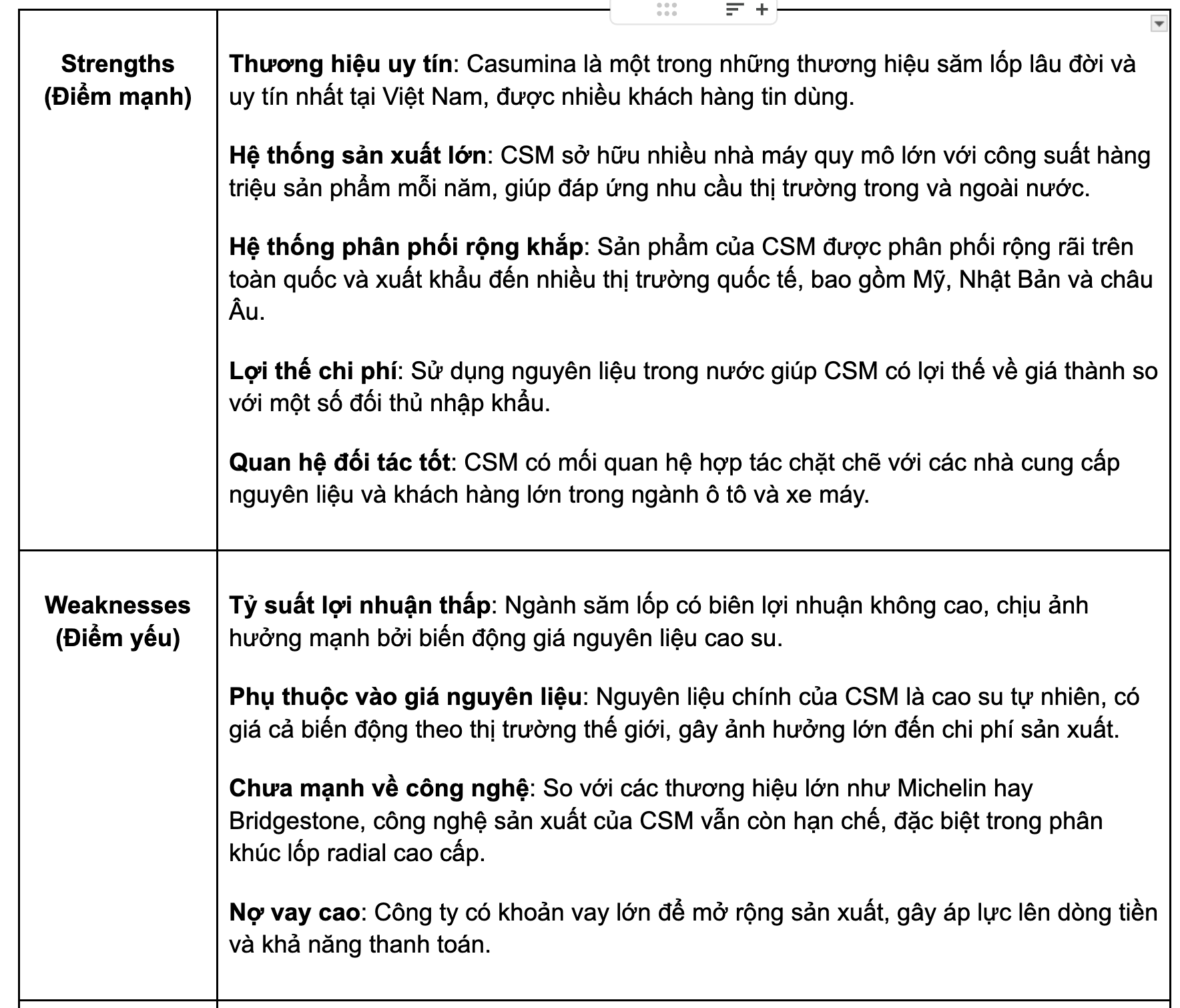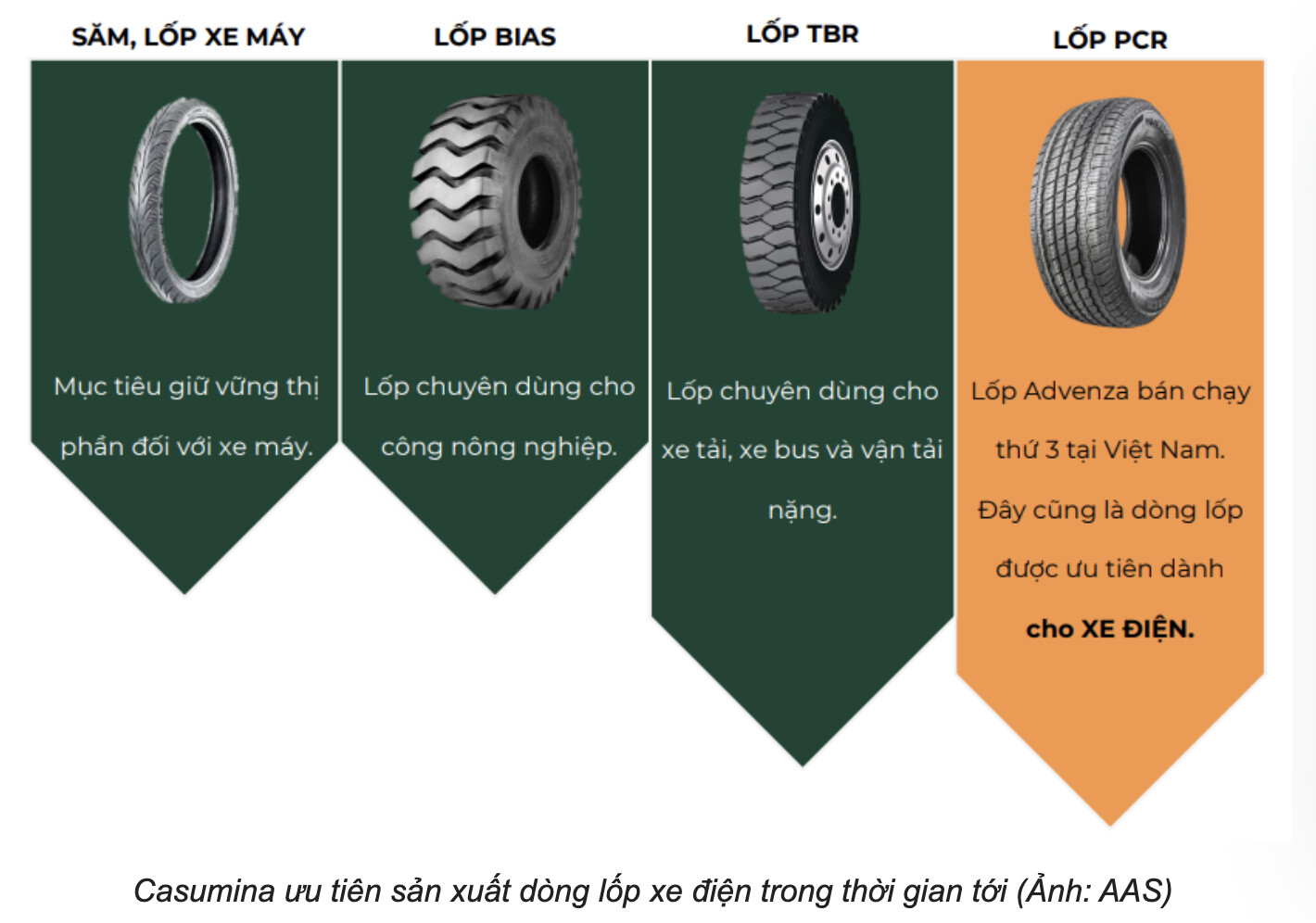 - Thương hiệu mạnh: Casumina là thương hiệu lốp xe hàng đầu Việt Nam, có lợi thế cạnh tranh trong phân khúc lốp bias (lốp bố vải) và đang mở rộng mảng lốp radial.