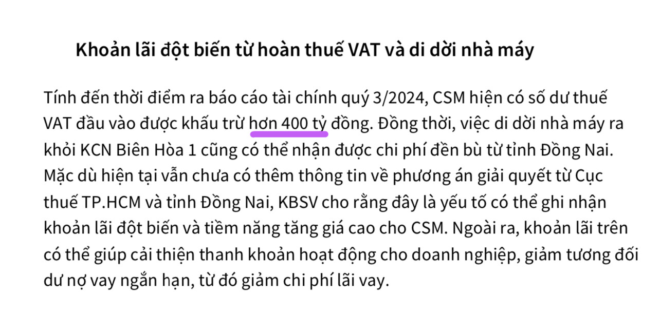 Ngoài ra, CSM giảm chi phí khấu hao nhà máy vào quý 2/2025, cải thiện biên lợi nhuận gộp, giúp gia tăng lợi nhuận ròng, EPS cũng sẽ tăng. Đồng thời định giá doanh nghiệp cao hơn (P/E, P/B tăng) và giảm rủi ro tài chính. Đây sẽ là yếu tố quan trọng giúp CSM tăng trưởng mạnh trong dài hạn.