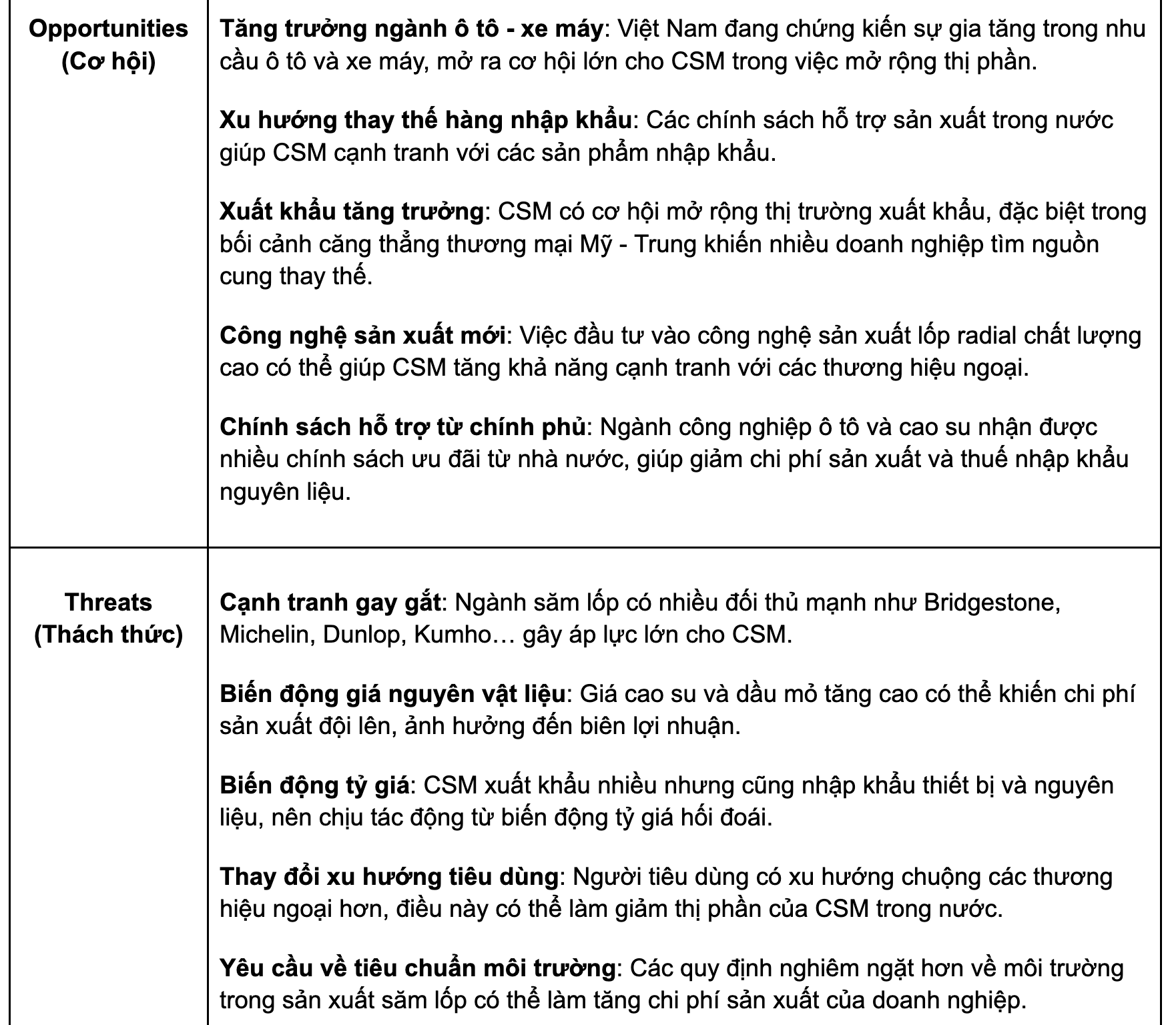 - Hợp tác nội địa – lợi thế cạnh tranh: Việc trở thành đối tác của VinFast giúp CSM có lợi thế cung ứng trong nước, giảm chi phí logistics và cạnh tranh tốt hơn với lốp nhập khẩu.