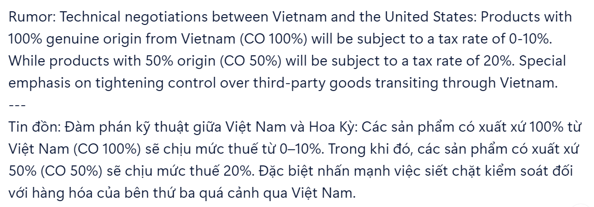 Tin đồn: Tin tức bên lề từ đoàn đàm phán kỹ thuật giữa Việt Nam và Hoa Kỳ: Các sản phẩm có 100% xuất xứ chính hãng từ Việt Nam (CO 100%) sẽ chịu mức thuế 0–10%, trong khi các sản phẩm có 50% xuất xứ (CO 50%) sẽ chịu mức thuế 20%. Có sự nhấn mạnh đặc biệt vào việc thắt chặt kiểm soát đối với hàng hóa của bên thứ ba quá cảnh qua Việt Nam. Các cuộc đàm phán cấp Bộ trưởng đã diễn ra vào ngày 17 tháng 5.