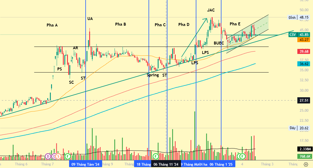 Giá cổ phiếu có một nhịp bật tăng mạnh với thanh khoản lớn kích hoạt từ dòng tiền lớn của tổ chức. Vùng giá mua của tổ chức sẽ từ 36.5 -41.3. Trong khoảng thời gian 4 tuần cổ phiếu đã tăng giá ~ 30% từ nền đi lên tiện cận vùng giá 48 xuất hiện một nến đảo chiều ( trong bối cảnh TT chung cũng có tín hiệu đảo chiều khi tiệm cận lại vùng giá 1280-1300). VNINDEX điều chỉnh 4% CSV điểu chỉnh về mức hỗ trợ 42.2 và xuất hiện tín hiệu quét thanh khoản tại 40.3 bằng một cây nến rút chân tương đối dài. Sau đó cổ phiếu có nhịp retest lại với thanh khoản thấp hơn tuần giá bật lên sau khi quét thanh khoản (+1 tín hiệu tích cực cho thấy cung đang được hấp thụ tốt). Tuần gần nhất CSV đã nhen nhóm tín hiệu bật lên với thanh khoản tương đối tốt khi TT chung có nhịp bật lên bởi sự dẫn dắt của nhóm Bank nâng đỡ thị trường. Tuy nhiên khi tiến về vùng 45 cũng là vùng mà tại đó lượng cung lớn được bán ra do nđt kẹp hàng khi đã mua đuổi ở những tuần trước đó. Kết quả trên nến tuần đóng cửa với sắc xanh cho thấy lượng cung vẫn đang được tổ chức hấp thụ (điểm tích cực số 2 là thanh khoản đã sát với TB 10 tuần). Ở thời điểm hiện tại chúng ta đang có gì: