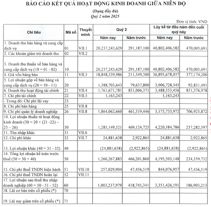 Q1/2025: Doanh thu thuần đạt 20,57 tỷ đồng, gấp 114 lần so với cùng kỳ, LNST tiếp tục ghi nhận tăng trưởng đột biến đạt 2,35 tỷ (+1.112,8% YoY) nhờ nền lợi nhuận đầu năm ngoái ở mức cực thấp. Quý 1 không có kiểm toán nên doanh thu không được thuyết minh cụ thể nguồn thu từ các đối tác nào, nhưng trong mục giao dịch với các bên liên quan có ghi nhận gần 1 tỷ đồng lợi nhuận đến từ việc hợp tác kinh doanh với CTCP Công nghệ Chuỗi khối Onuschain, CTCP Vàng bạc Đác quý Hanagold, và CTCP Công nghệ Chuỗi khối ETH.